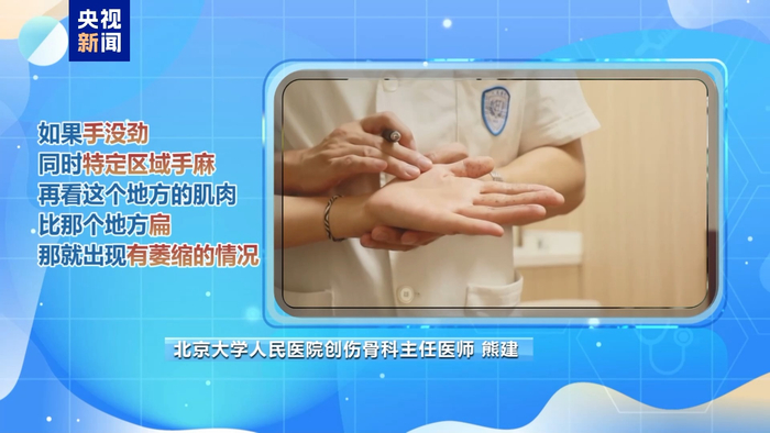 北京大学人民医院创伤骨科主任医师 熊建:不知道肌肉是不是有萎缩,就两个对比一下,如果肌肉很圆很饱满,按压的时候很饱满的,这个时候就说明是正常的;如果你手没劲,同时特定区域手麻,再看这个地方的肌肉比那个地方扁,那就出现有萎缩的情况。