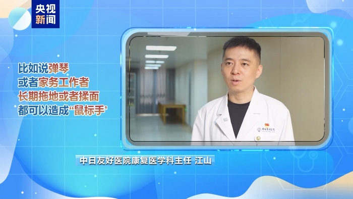 中日友好医院康复医学科主任 江山:比如说我们弹琴或者是一些家务工作者,长期拖地或者揉面,都可以造成“鼠标手”。
