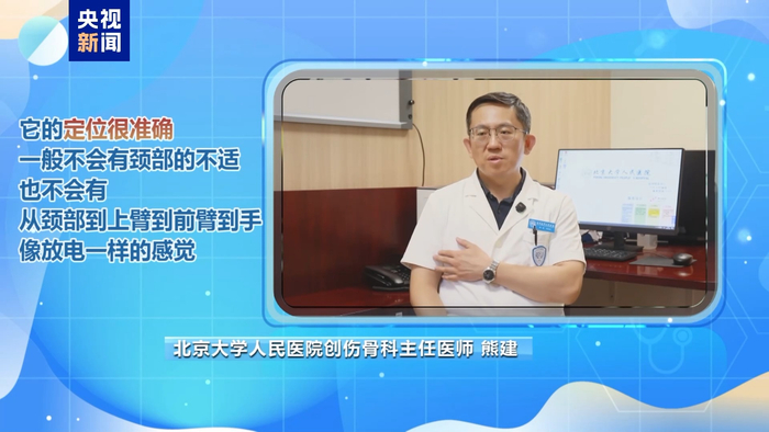 北京大学人民医院创伤骨科主任医师 熊建:它的定位很准确,一般来讲不会有颈部的不适,也不会有像咱们颈椎病那样很典型的从颈部到上臂到前臂到手这种像放电一样的感觉。它支配的区域就是大拇指、食指、中指和无名指的一半,所以最典型的症状就是三个半手指的麻木。有时候你刺激它或者压迫时间长了,会出现这种跟放电一样,感觉一下就麻木了,麻木到手。