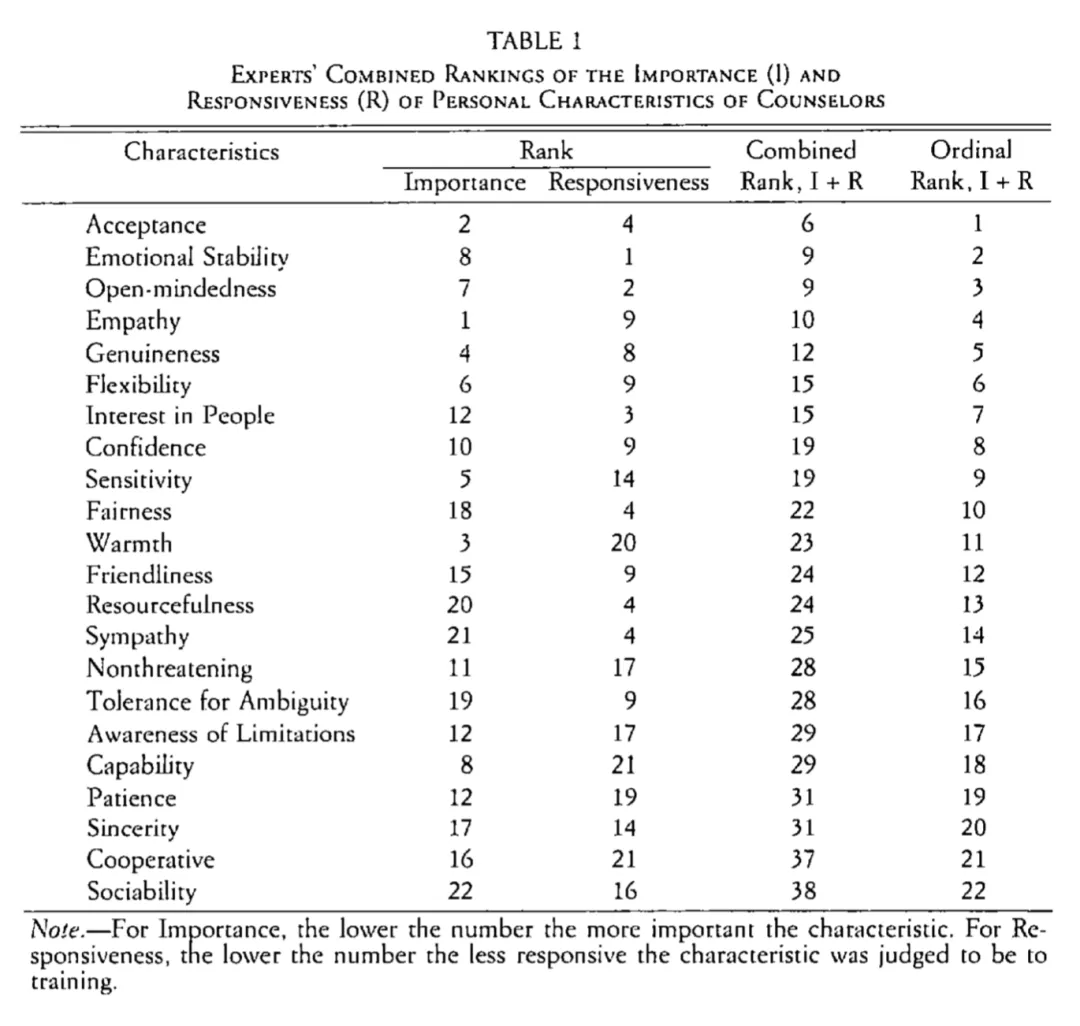 这些专家被要求对22个心理咨询师特质的重要性进行排序,最终结果为下图所示:重要性位列前5位的为共情、接纳、热情、真诚和敏锐。