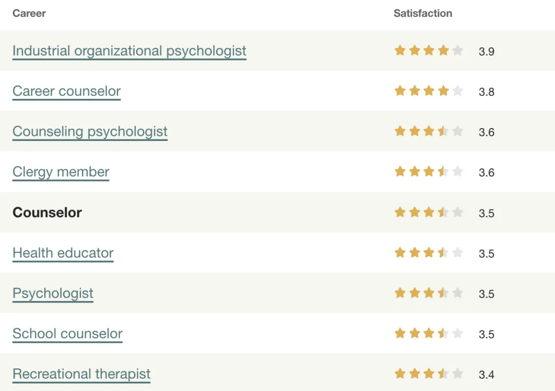 相较而言,心理咨询师的职业幸福感和意义感较高。根据CareerExplorer的调查,心理咨询师的职业幸福感评分为3.5/5,位列200余种接受调查的职业前沿。