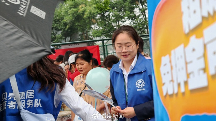 日前,成都惠居志愿者服务队正式成立后的首场公益活动,在成都12个社区同步开展。在同一天,这支由贝壳惠居成都站员工与青年租客组成的数百人服务队,身着蓝马甲,为住户们带来敬老及免费空调、油烟机清洗等服务。
