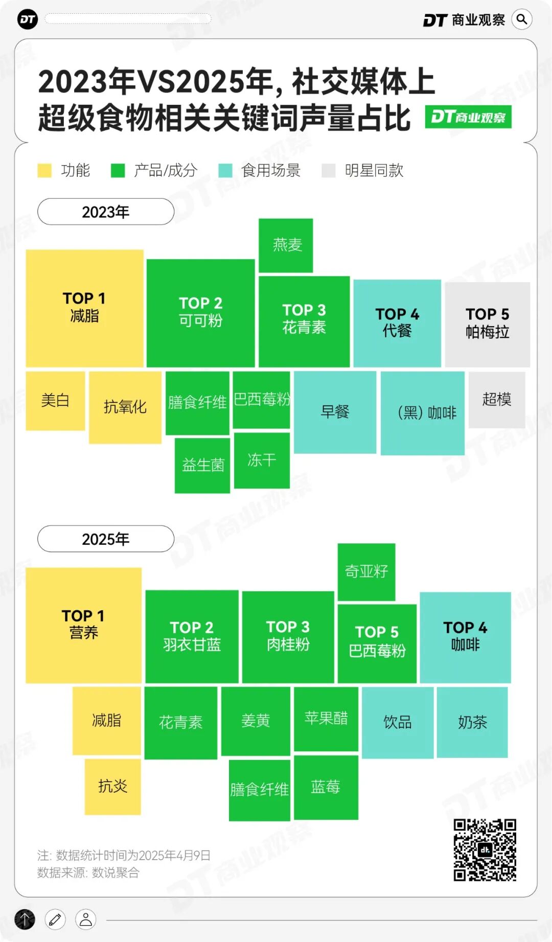 从社交媒体数据来看,2023年,超级食物相关热词TOP1是减脂,最常见的食用场景是“代餐”,2025年,超级食物相关热词TOP1变成了“营养”,并且更多地融入日常饮品。