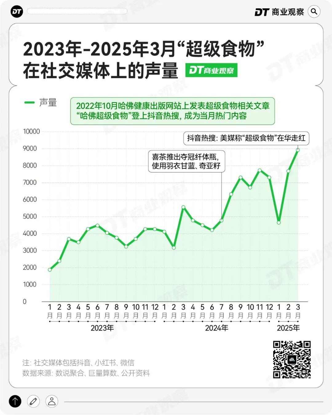 然而后续,这篇文章流传到中文互联网,变成了“哈佛推荐的10种超级食物”,不断放大“超级食物”的功效,甚至在某些养生自媒体上,它们成了可以“抗癌”的神奇食物,“超级食物”在社交媒体上的声量由此开始提升。